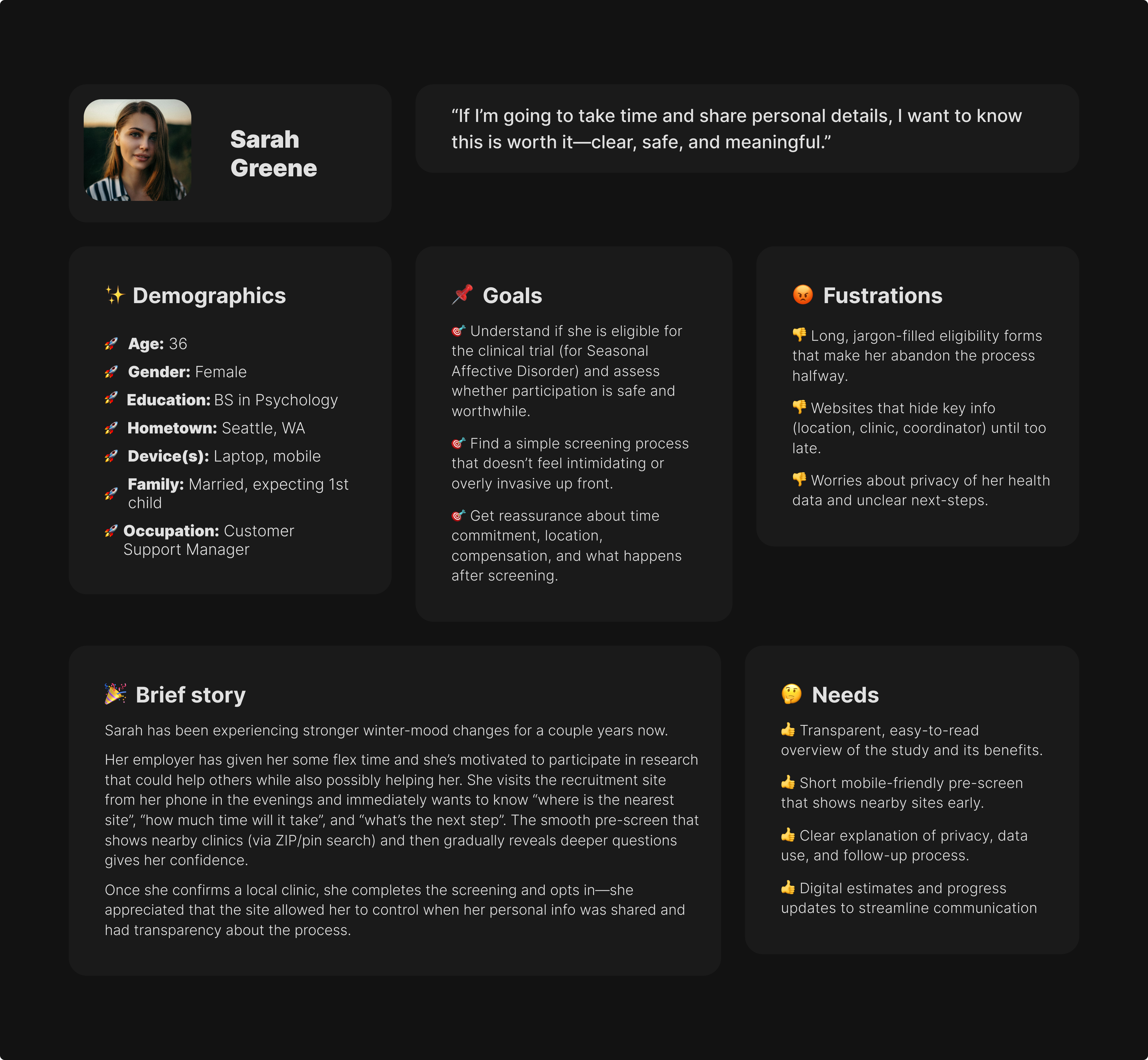 The biggest learning: reducing uncertainty early transforms both user confidence and organizational outcomes. If expanded, I’d pilot IP-based pre-qualification and personalized trial recommendations to make future research sign-ups even faster.